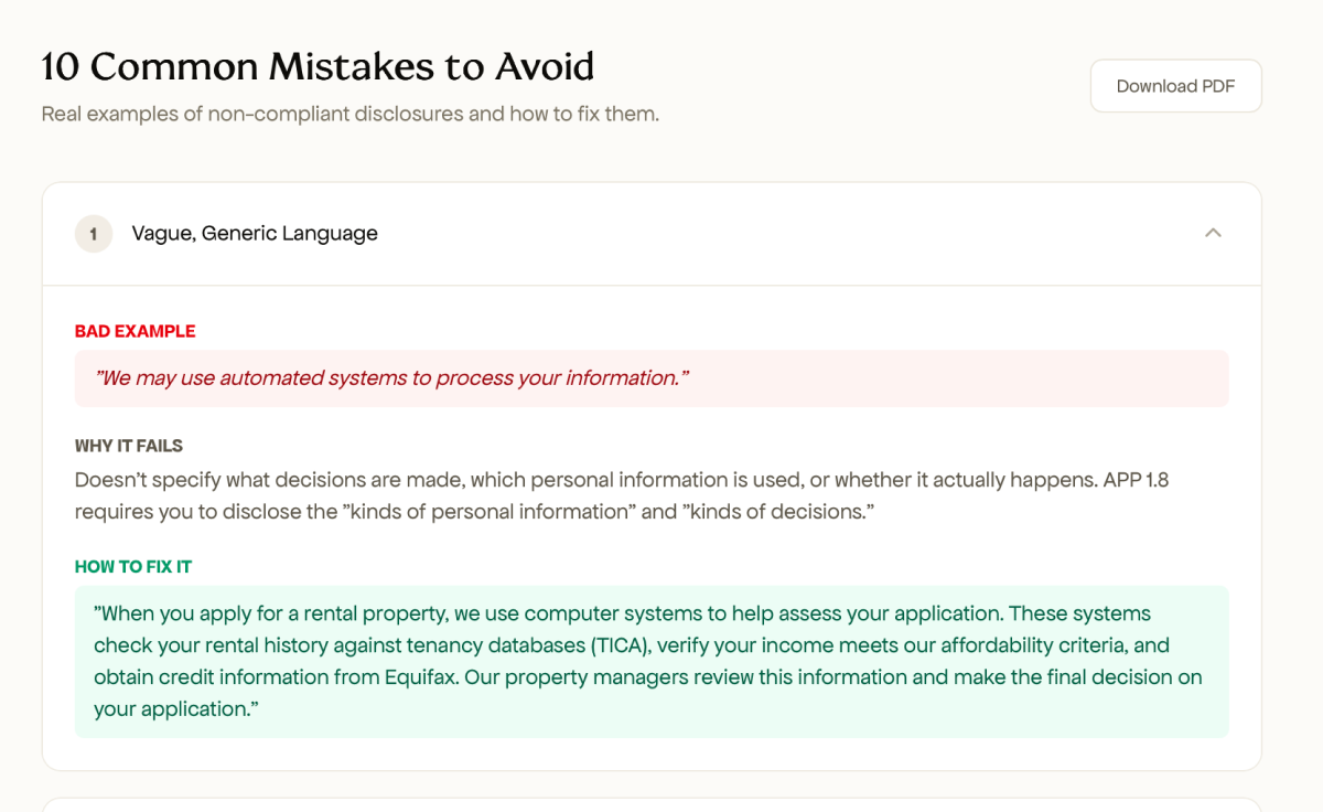 Yes. This is built specifically for Australia's Privacy Act amendments and OAIC requirements. It references the exact Australian Privacy Principles (APPs) and uses OAIC's guidance on what constitutes "significantly affects rights or interests."